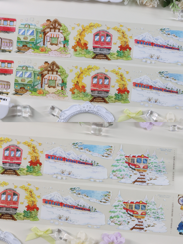 Whimsical and nostalgic. This series features steam trains, European-style cottages, and winding tracks, reminiscent of a classic fairytale journey. It evokes the excitement of travel and the magic of childhood stories. A wonderful addition to travel journals or story-telling spreads.